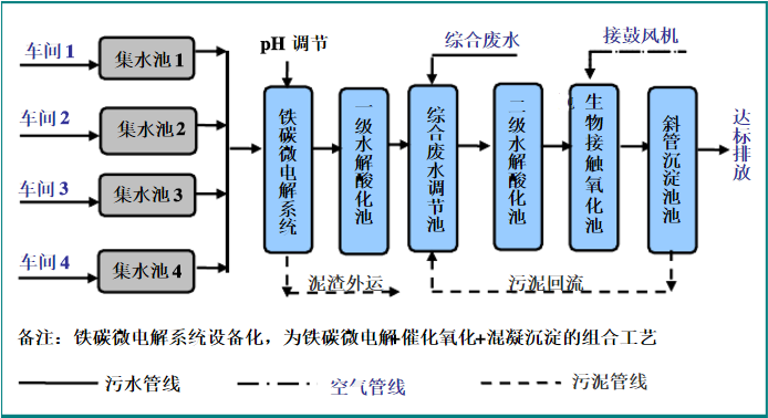 各類(lèi)生產(chǎn)線(xiàn)的廢水進(jìn)行單獨(dú)收集,之后統(tǒng)一送入初調(diào)節(jié)池中進(jìn)行水質(zhì)的調(diào)節(jié),;預(yù)處理采用“鐵碳微電解+催化氧化+混凝沉淀”工藝,沉淀溢流到一級(jí)水解酸化池中,之后流入到綜合調(diào)節(jié)池中,與生活污水、清潔下水混合后,送入二級(jí)水解酸化池,水解后出水至生物接觸氧化池中進(jìn)行好氧處理,處理后水進(jìn)入沉淀池中,上清液排放。